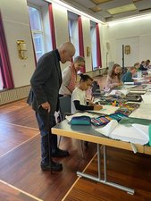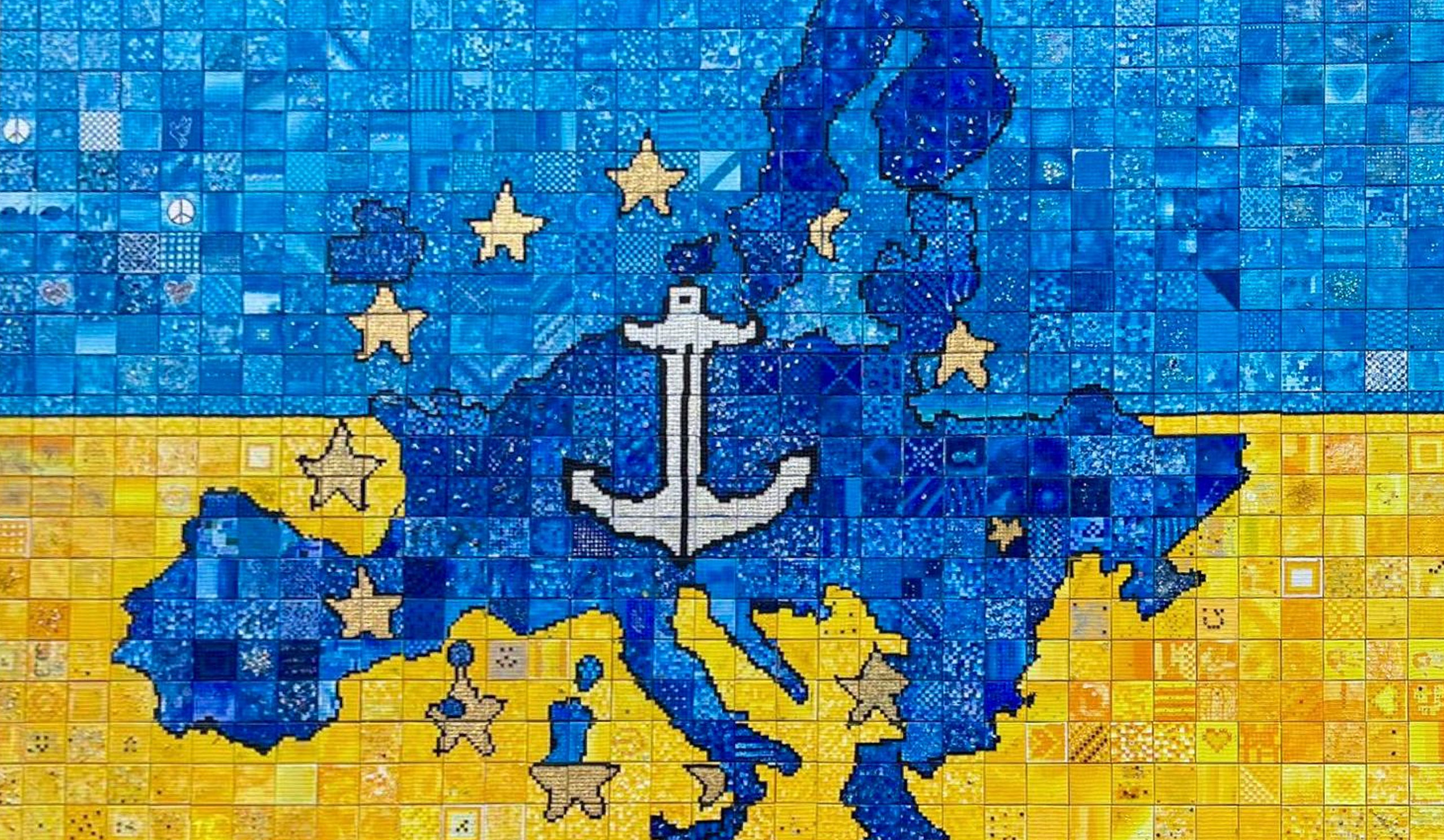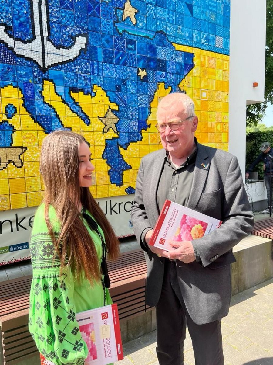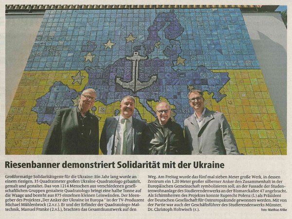 Wir freuen uns, wenn Sie bei der Eröffnung des großen Gemeinschaftsbildes am Aasee dabei sind, welches aus 875 einzelnen Quadratologo-Leinwänden besteht und zusammengesetzt eine Größe von 5 x 7 Meter ergibt. Der Hintergrund des Bildes besteht aus den Farben der ukrainischen Flagge blau und gelb, darauf werden die geografischen Umrisse von Europa gezeigt, welche durch goldene Sterne der Europa-Flagge umkreist werden. Im Mittelpunkt des Bildes steht ein 1,20 m großer, silberner Anker als Symbol der europäischen Gemeinschaft. Ein Jahr lang haben 1214 Menschen aus verschiedenen sozialen Bereichen in Münster gemeinsam gemalt und freuen sich nun, ein Teil der Botschaft zu sein.
