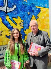 Wir freuen uns, wenn Sie bei der Eröffnung des großen Gemeinschaftsbildes am Aasee dabei sind, welches aus 875 einzelnen Quadratologo-Leinwänden besteht und zusammengesetzt eine Größe von 5 x 7 Meter ergibt. Der Hintergrund des Bildes besteht aus den Farben der ukrainischen Flagge blau und gelb, darauf werden die geografischen Umrisse von Europa gezeigt, welche durch goldene Sterne der Europa-Flagge umkreist werden. Im Mittelpunkt des Bildes steht ein 1,20 m großer, silberner Anker als Symbol der europäischen Gemeinschaft. Ein Jahr lang haben 1214 Menschen aus verschiedenen sozialen Bereichen in Münster gemeinsam gemalt und freuen sich nun, ein Teil der Botschaft zu sein.
